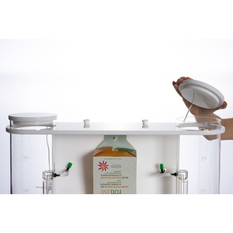 Easyractor 4L es un reactor bicilindrico realizado en metacrilato de forma troncocónina y diseñado especificamente para el cultivo semi automatizado de rotífero mediante el alimento para rotífero Easyroti.